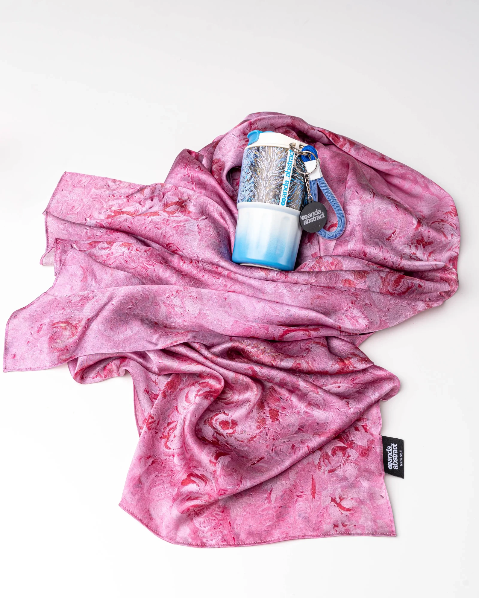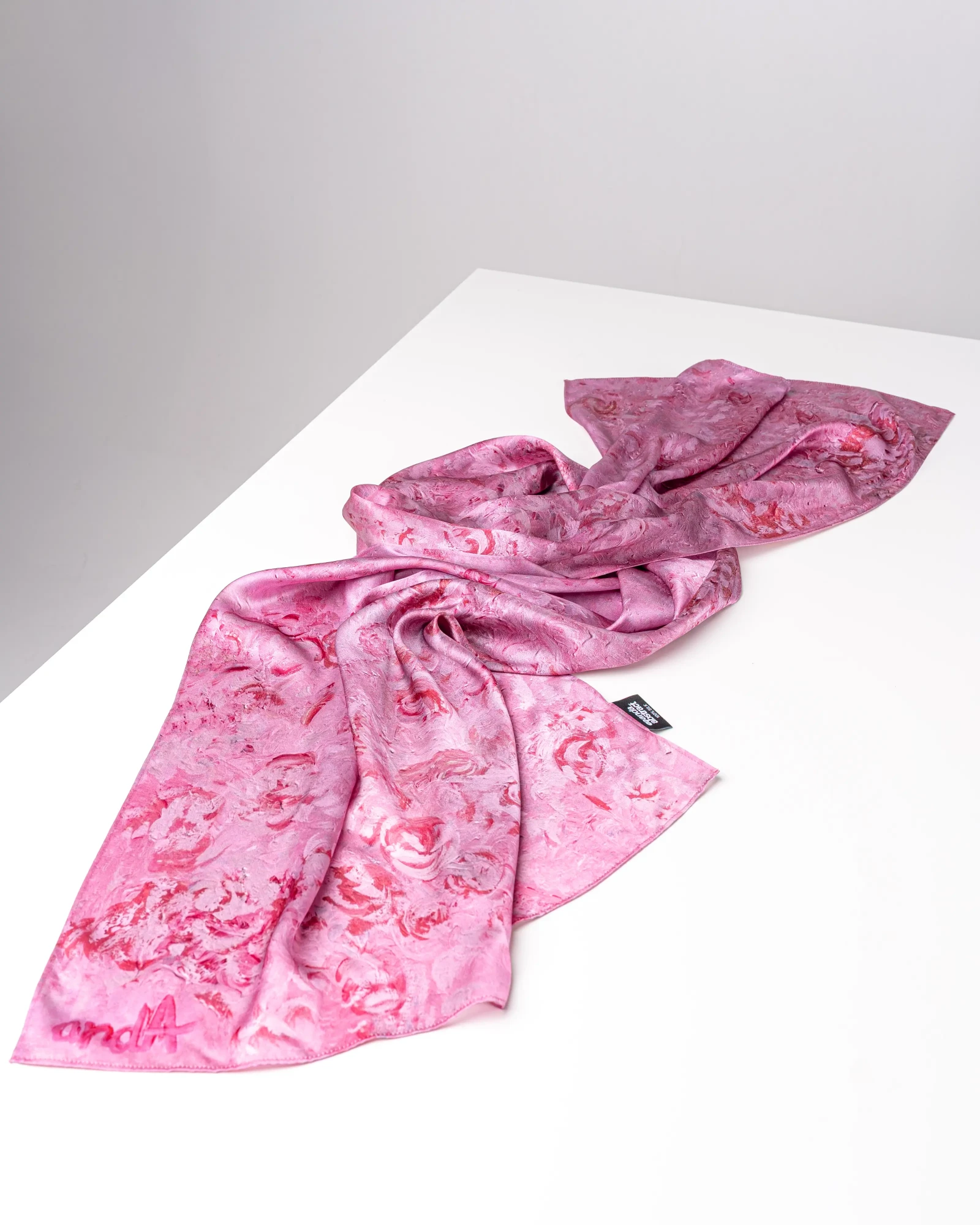 The Roses unisex silk scarf by Anda_Abstract (180×53 cm) blends romantic elegance with artistic style. Made from premium 12 mm satin silk, it features soft pink and purple tones with delicate rose motifs inspired by Anda Neimane’s art. Lightweight, breathable, and hypoallergenic, it’s a versatile accessory for everyday wear or gifting—sustainably made in Latvia.