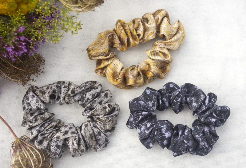 Anda Abstract Small 2.5 cm Silk Hair Scrunchies Set of Three Designs: "Summer Morning", "Rose Bay" and "Golden Sand"