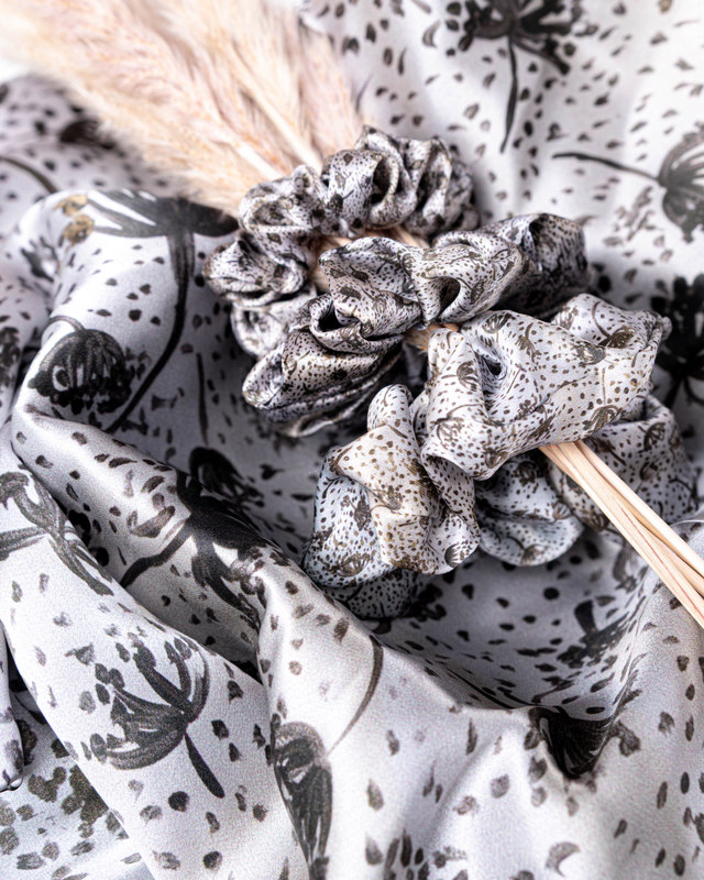 SUMMER MORNING golden black with silver-gray dandelion fluff makes these scrunchies a universal accessory for any occasion. They are presented in elegant branded packaging that reflects Anda_abstract’s unique quality and style.